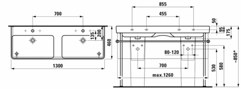 Dvojumyvadlo Laufen Pro S 130x46 cm dva otvory pro baterii H8149684001041