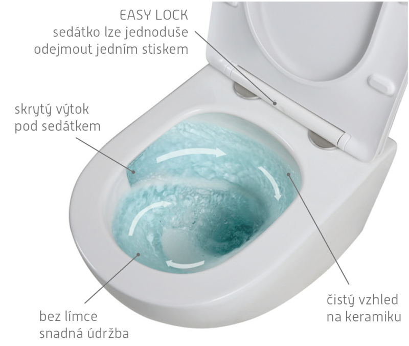 - systém snadného odejmutí sedátka tzv. easy lock v 1 bodu výrazně usnadňuje údržbu celé toalety.