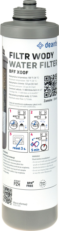 Filtr wymienny do zestawu filtracji wody (BFF_XZFP) należy wymieniać co pół roku lub po przefiltrowaniu 11 000 litrów wody. Produkt jest łatwy w montażu, co umożliwia szybkie i wygodne utrzymanie najwyższej jakości filtrowanej wody na co dzień, dbając jednocześnie o zdrowie i komfort użytkowników.