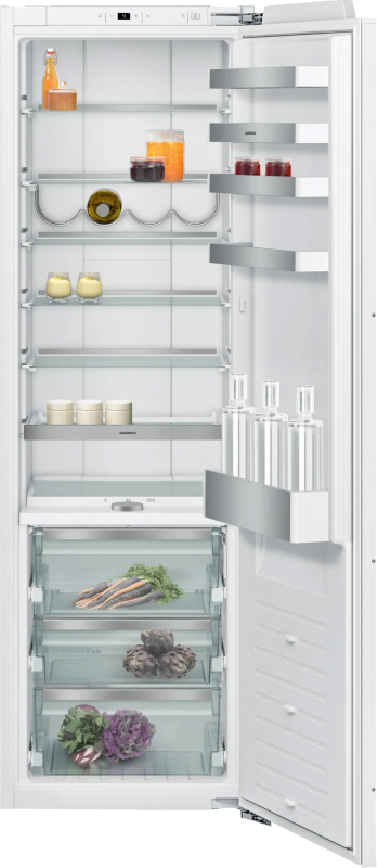 Výškově nastavitelné police z bezpečnostního skla, dveřní police s hliníkovými profily, polstrovaný systém zavírání dveří umožňující měkké a kontrolované zavírání dveří, celkový objem 289 litrů. Rozměry: výška 177 cm, šířka 56 cm, hloubka 55 cm