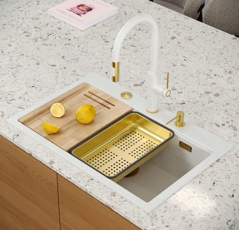 Granitový dřez se svým minimalistickým, moderním vzhledem hodí do aranžmá každé kuchyně. Hluboká a prostorná komora zajišťuje vysoký komfort používání. Dřez, který nabízíme, je skvělou volbou pro zákazníky, kteří ocení kvalitu a zpracování. Nadčasový tvar, použití prvotřídních materiálů a technologií, skvělý design a kompatibilita použitých řešení zaručují dokonalý konečný výsledek a vyplní každý kuchyňský prostor. K dispozici jsou různé barevné varianty. Tento model je velmi bohatě vybaven doplňkovými kuchyňskými doplňky. Dřez je dodáván s dávkovačem tekutin, bambusovým prkénkem, odkapávačem a válcovanou ocelovo-silikonovou podložkou (není součástí sady ve zlaté a měděné variantě).