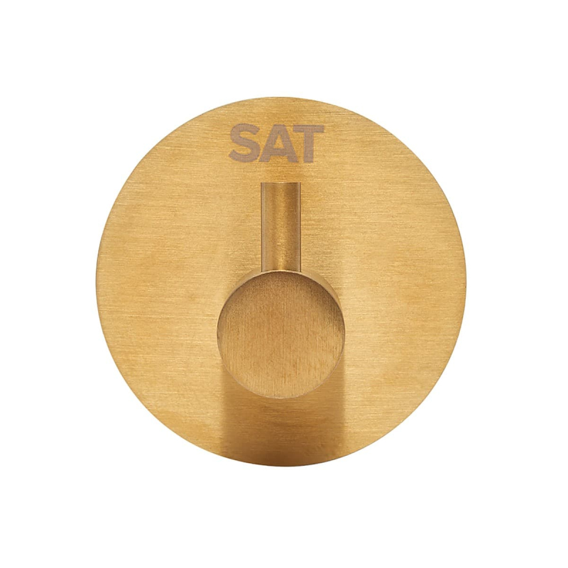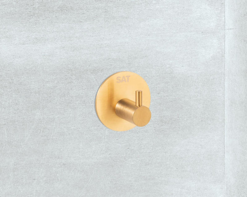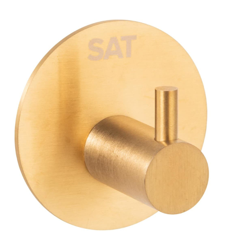 Háček v barevném provedení broušené zlato. Šířka tohoto koupelnového doplňku od značky SAT je 4,8 cm a je vyroben z materiálu nerez. Montáž bez nutnosti vrtání, pouze lepením.