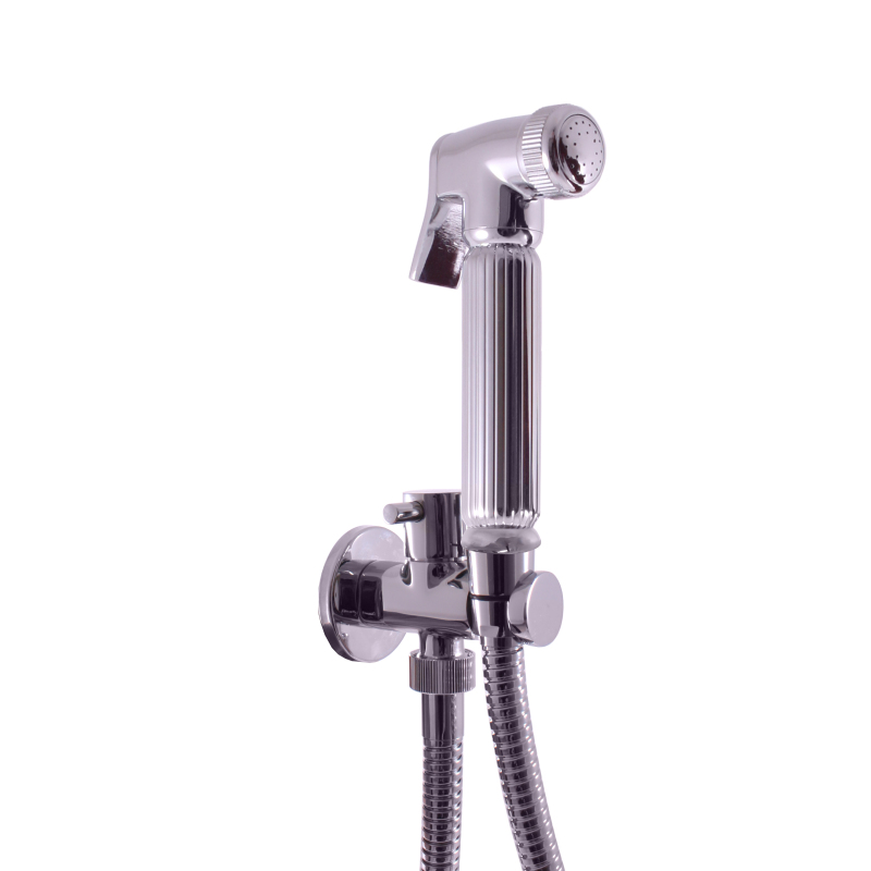 Hygienický komplet na dvě použití (na jednu vodu nebo na dvě vody s použitím vestavěné baterie), s průtočným držákem s keramickým ventilem, sprcha s tlačítkovým mechanismem - kov