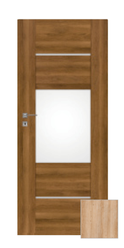 Moderní interiérové dveře, které budou ozdobou každého interiéru. Rámová konstrukce z MDF s kvalitní fólií v žádaném a velmi pěkném. Výplň je poskládána z panelů z MDF ve stejném dekoru a bílého matného skla tl. 4 mm. Zasklení bez zasklívacích rámečků působí velice estetickým dojmem. Dveře lze osadit jak do stávající ocelové zárubně v české normě nebo do obložkové zárubně. Dveře mají dozický zámek na klíč (rozteč 72 mm).