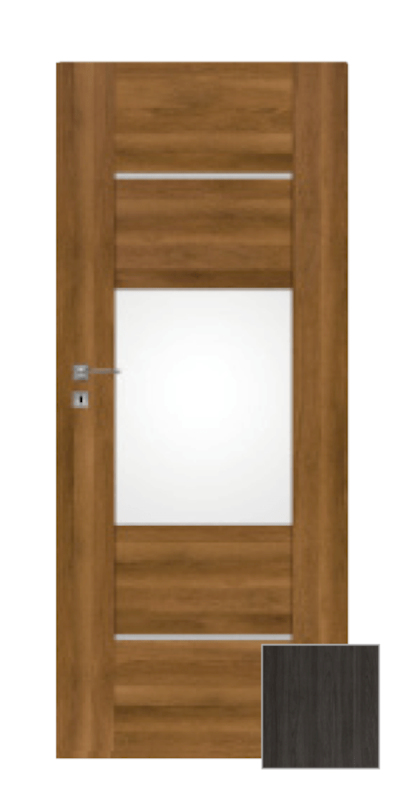 Moderní interiérové dveře, které budou ozdobou každého interiéru. Rámová konstrukce z MDF s kvalitní fólií v žádaném a velmi pěkném. Výplň je poskládána z panelů z MDF ve stejném dekoru a bílého matného skla tl. 4 mm. Zasklení bez zasklívacích rámečků působí velice estetickým dojmem. Dveře lze osadit jak do stávající ocelové zárubně v české normě nebo do obložkové zárubně. Dveře mají dozický zámek na klíč (rozteč 72 mm).