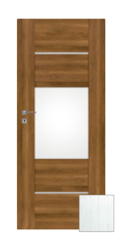 Moderní interiérové dveře, které budou ozdobou každého interiéru. Rámová konstrukce z MDF s kvalitní fólií v žádaném a velmi pěkném. Výplň je poskládána z panelů z MDF ve stejném dekoru a bílého matného skla tl. 4 mm. Zasklení bez zasklívacích rámečků působí velice estetickým dojmem. Dveře lze osadit jak do stávající ocelové zárubně v české normě nebo do obložkové zárubně. Dveře mají dozický zámek na klíč (rozteč 72 mm).