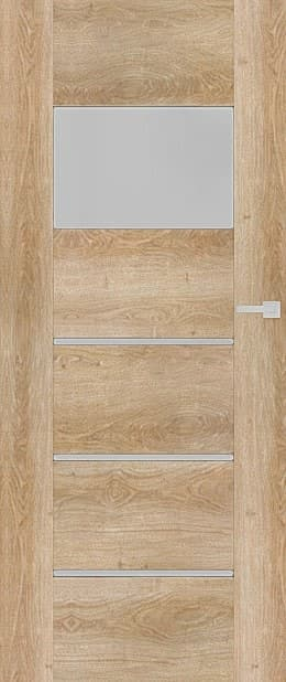 Moderní interiérové dveře, které budou ozdobou každého interiéru. Rámová konstrukce z MDF s kvalitní fólií v žádaném a velmi pěkném. Výplň je poskládána z panelů z MDF ve stejném dekoru a bílého matného skla tl. 4 mm. Zasklení bez zasklívacích rámečků působí velice estetickým dojmem. Dveře lze osadit jak do stávající ocelové zárubně v české normě nebo do obložkové zárubně. Dveře mají dozický zámek na klíč (rozteč 72 mm).