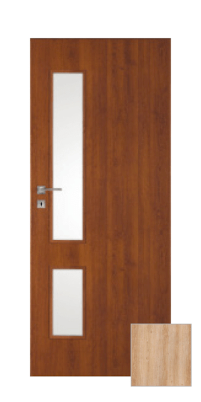 Moderní interiérové dveře, které budou ozdobou každého interiéru. Desková konstrukce s dřevěným rámem, voštinovou výplní, bílé matné sklo tl. 4 mm, odolná 3D fólií v žádaném a velmi pěkném dekoru. Dveře lze osadit jak do stávající ocelové zárubně v české normě nebo do obložkové zárubně. Dveře mají dozický zámek na klíč (WK) (rozteč 72 mm).