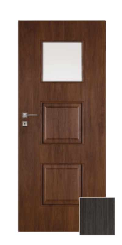 Moderní interiérové dveře, které budou ozdobou každého interiéru. Desková konstrukce s dřevěným rámem, voštinovou výplní, bílé matné sklo tl. 4 mm, odolná 3D fólií v žádaném a velmi pěkném dekoru. Dveře lze osadit jak do stávající ocelové zárubně v české normě nebo do obložkové zárubně. Dveře mají dozický zámek na klíč (WK) (rozteč 72 mm).