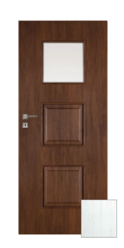 Moderní interiérové dveře, které budou ozdobou každého interiéru. Desková konstrukce s dřevěným rámem, voštinovou výplní, bílé matné sklo tl. 4 mm, odolná 3D fólií v žádaném a velmi pěkném dekoru. Dveře lze osadit jak do stávající ocelové zárubně v české normě nebo do obložkové zárubně. Dveře mají dozický zámek na klíč (WK) (rozteč 72 mm).