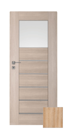 Moderní interiérové dveře, které budou ozdobou každého interiéru. Rámová konstrukce z MDF s kvalitní fólií v žádaném a velmi pěkném. Výplň je poskládána z panelů z MDF ve stejném dekoru a bílého matného skla tl. 4 mm. Zasklení bez zasklívacích rámečků působí velice estetickým dojmem. Dveře lze osadit jak do stávající ocelové zárubně v české normě nebo do obložkové zárubně. Dveře mají dozický zámek na klíč (rozteč 72 mm).