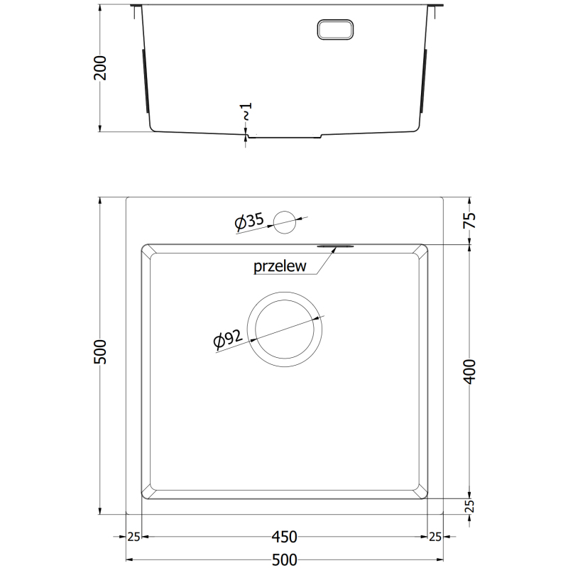 Specifikace produktu: Rozměr: 500x500x200 mm Hloubka dřezu: 200 mm Rozměry dřezu: 450x400 mm Tloušťka ocelového hran: 3 mm Tloušťka ocelového hran dřezu: 1 mm Poloměr zaoblení rohů dřezu: R10 Průměr odtoku: ø92 mm Typ: 1-dřez Typ: Vestavný Materiál: Nerezová ocel AISI 304 Barva: Zlatá Povrch: Hladký Povrchová úprava sifonu: Zlatá Otvor pro přepad: Ano Otvor pro baterii: Ano Ruční sifon s odpadkovým košem a zátkou Přídavný kryt odtoku Skrytý otvor pro přepad Zvukově izolační rohože k dřezu Odolnost vůči nárazům, poškrábání a změně barvy Odolnost vůči vysokým teplotám a tepelným šokům Povrch pro snadné čištění