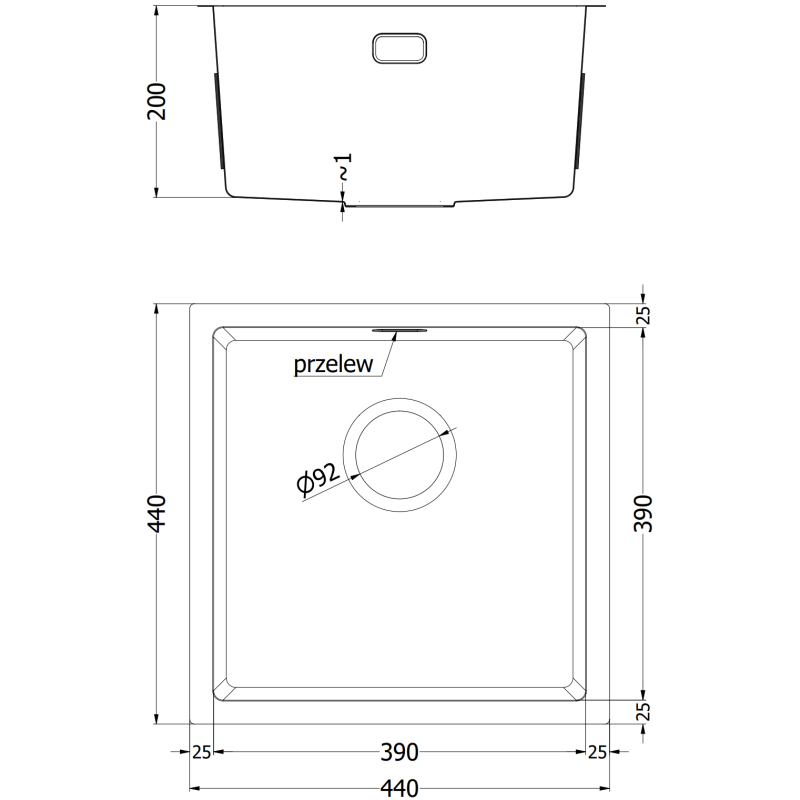 Specifikace produktu: Rozměr: 440x440x200 mm Hloubka dřezu: 200 mm Rozměry dřezu: 390x390 mm Tloušťka ocelového hran dřezu: 3 mm Tloušťka ocelového hran dřezu: 1 mm Poloměr zaoblení rohů dřezu: R10 Průměr odtoku: ø92 mm Typ: 1-dřez Typ: Vestavný, Pod desku Materiál: Nerezová ocel AISI 304 Barva: Inox Povrch: Voština Povrchová úprava sifonu: Inox Otvor pro přepad: Ano Otvor pro baterii: Ne Ruční sifon s odpadkovým košem a zátkou Přídavný kryt odtoku Skrytý otvor pro přepad Zvukově izolační rohože do dřezu Odolnost vůči nárazům, poškrábání a změně barvy Odolnost vůči vysokým teplotám a tepelným šokům Povrch pro snadné čištění