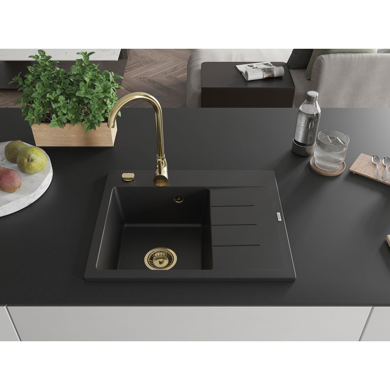 Jednodřezový žulový dřez Mexen Ben s odkapávačem, levý, 600 x 500 mm, černý, zlatý sifon - 6522605000-77-G