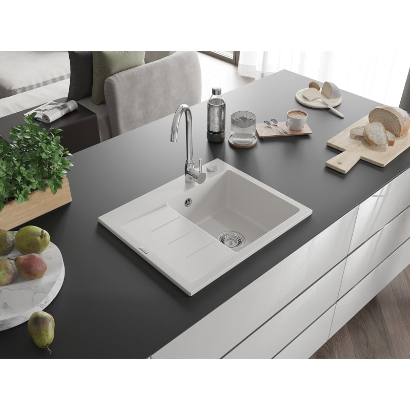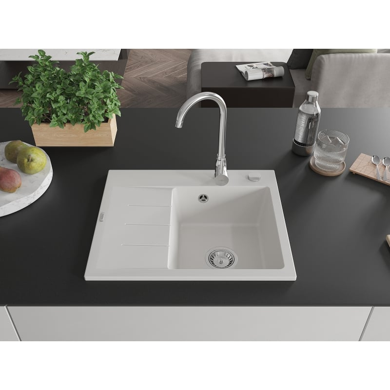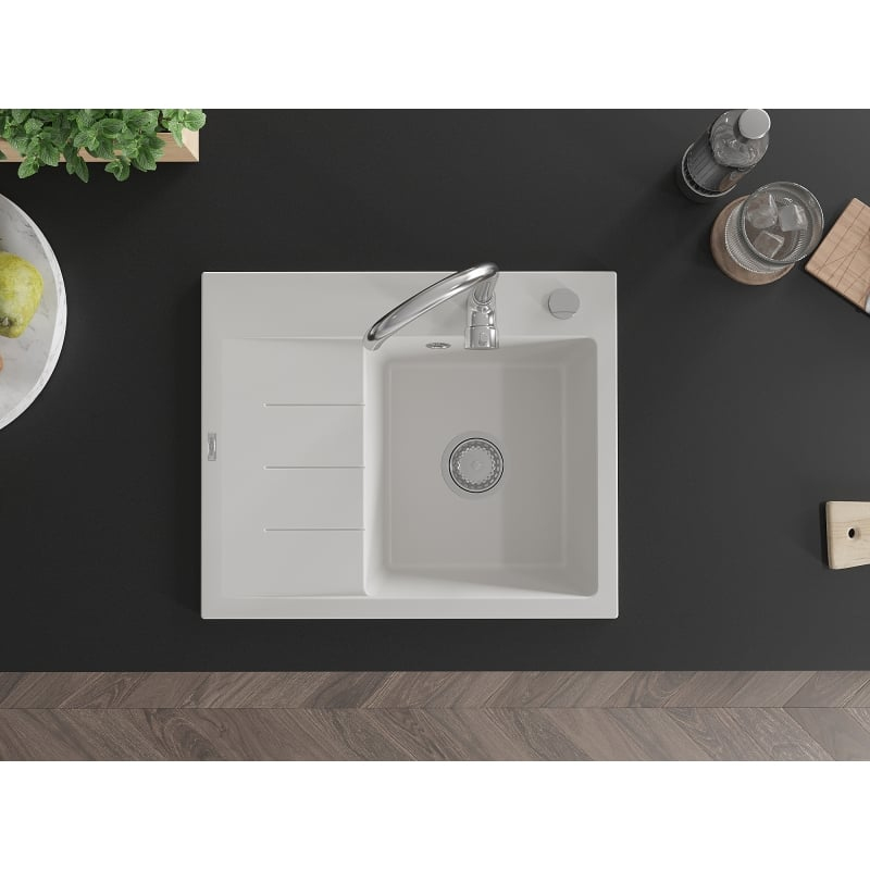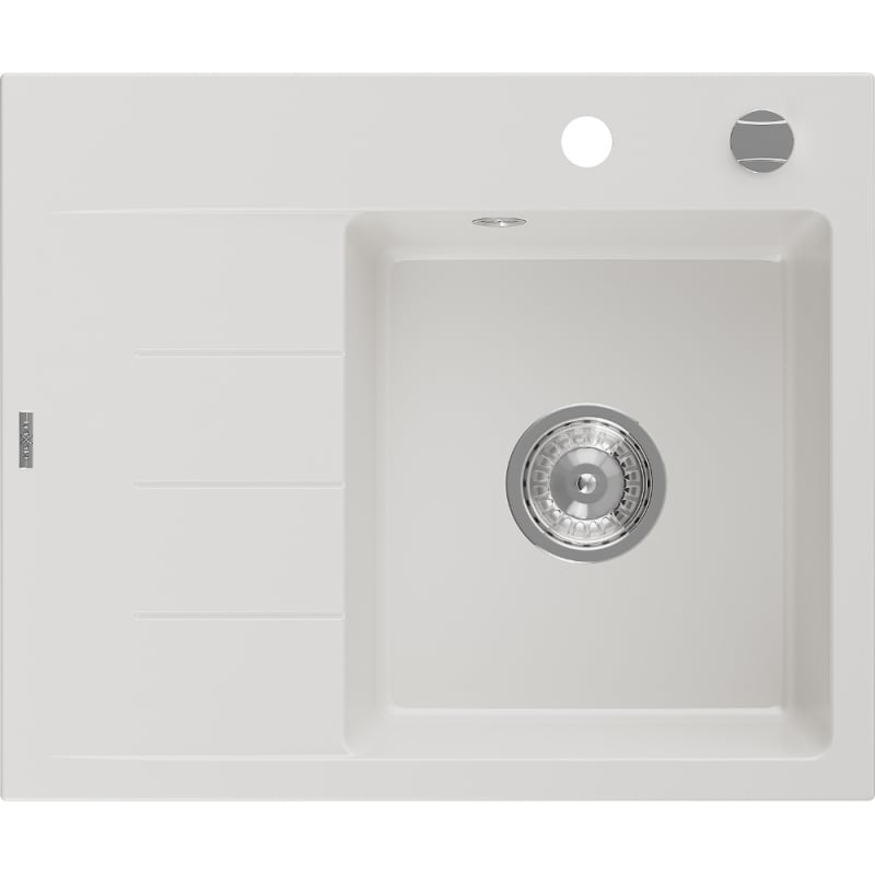 Jednodřezový žulový dřez Mexen Ben s odkapávačem, pravý, 600 x 500 mm, bílý, chromovaný sifon - 6523605000-20