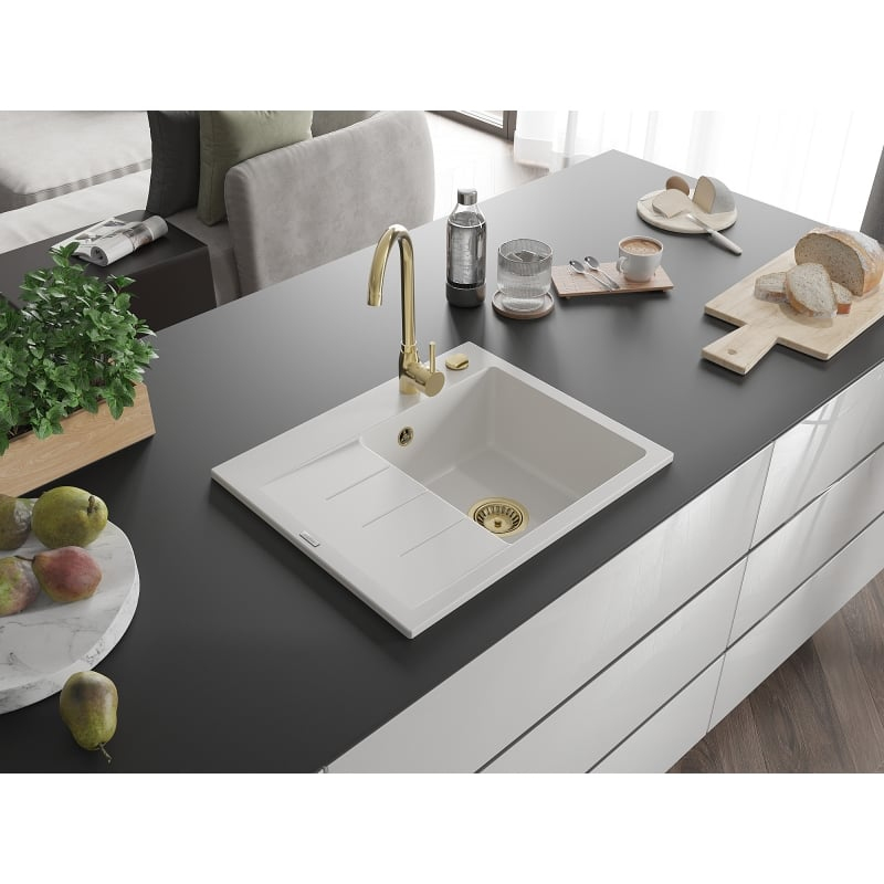 Jednodřezový žulový dřez Mexen Ben s odkapávačem, pravý, 600 x 500 mm, bílý, zlatý sifon - 6523605000-20-G