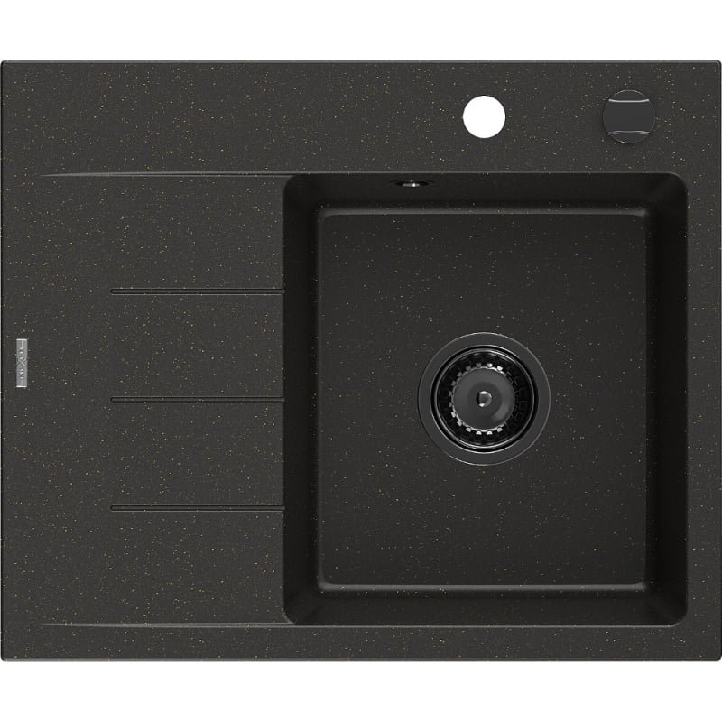 Jednodřezový žulový dřez Mexen Ben s odkapávačem, pravý, 600 x 500 mm, černá/zlatá metalíza, černý sifon - 6523605000-75-B
