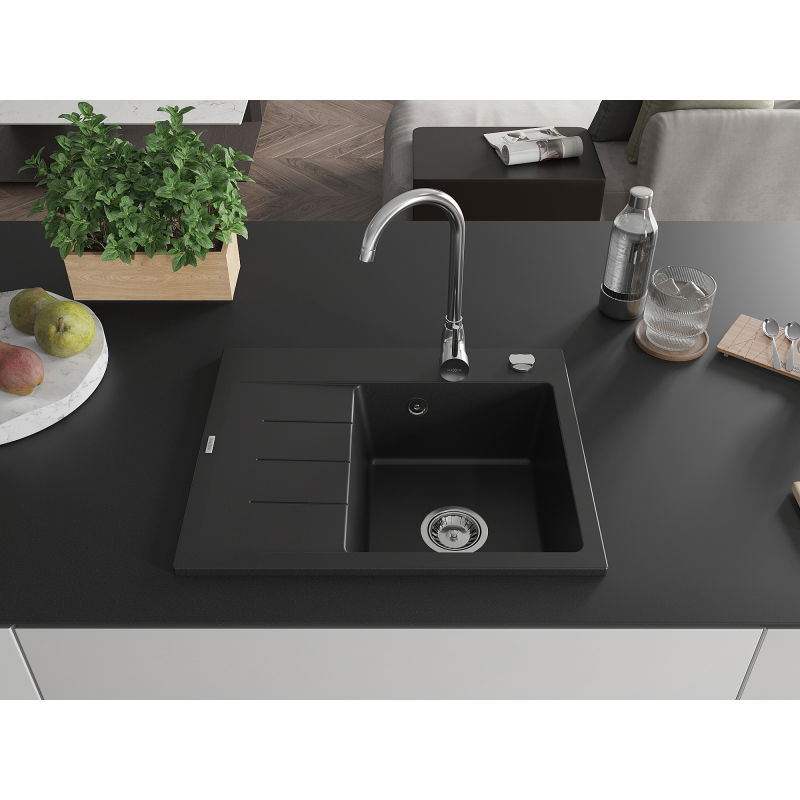 Jednodřezový žulový dřez Mexen Ben s odkapávačem, pravý, 600 x 500 mm, černý, chromovaný sifon - 6523605000-77