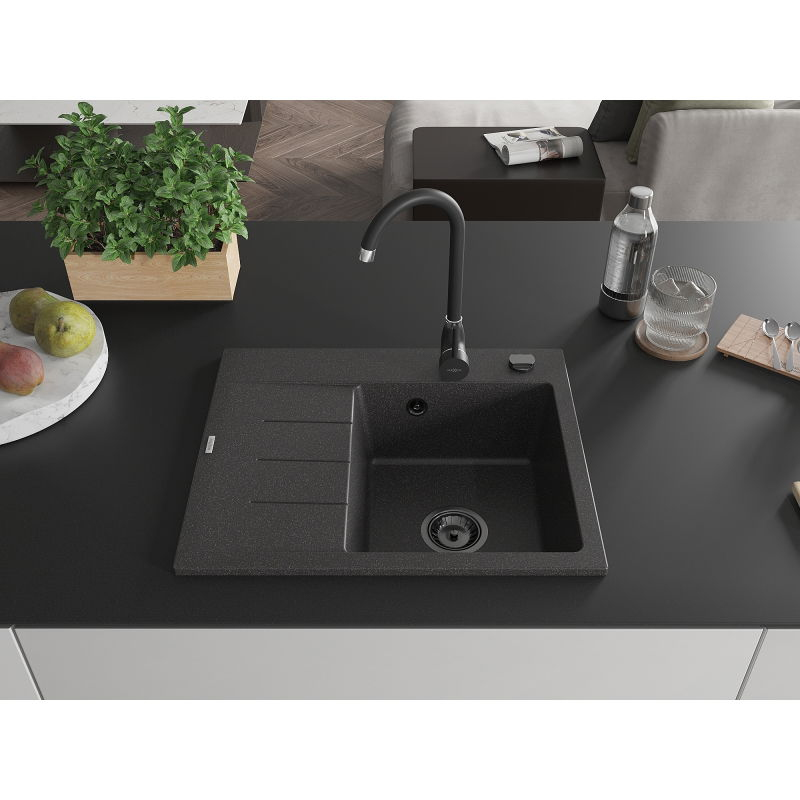 Jednodřezový žulový dřez Mexen Ben s odkapávačem, pravý, 600 x 500 mm, tečkovaná černá, černý sifon - 6523605000-76-B