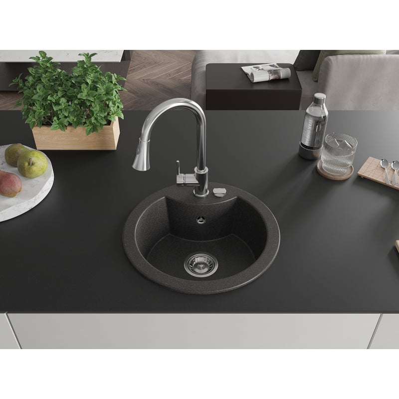 Technické údaje: Dřez: Rozměry: 488x488x167 mm Hloubka dřezu: 157 mm Šířka dřezu: 406 mm Průměr odtoku: ø90 mm Typ: 1-dřezový Typ: Vestavný Barva: Černá tečkovaná Povrchová úprava sifonu: Chrom Materiál: Žula (80 % žulového kameniva, 20 % pryskyřic) Přepadový otvor: Ano Otvory: (automatická baterie) 2 Vysoká odolnost proti poškrábání a změně barvy Odolnost vůči teplotním šokům Povrch pro snadné čištění Jeden další vyfrézovaný otvor pro samovrtání ø35 Kuchyňská baterie: Materiál: Mosaz Barva: Chrom Kartuše: Keramická Perlátor: Ano Typ: Pákový Výška baterie: 380 mm Rozsah výtoku: 252 mm Typ výtoku: Výsuvný
