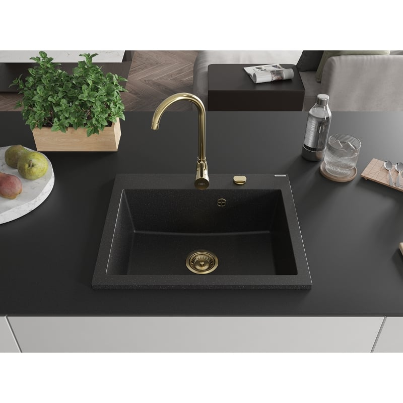 Jednodřezový žulový dřez Mexen Elix 600 x 500 mm, černá/stříbrná metalíza, zlatý sifon - 6525601005-73-G