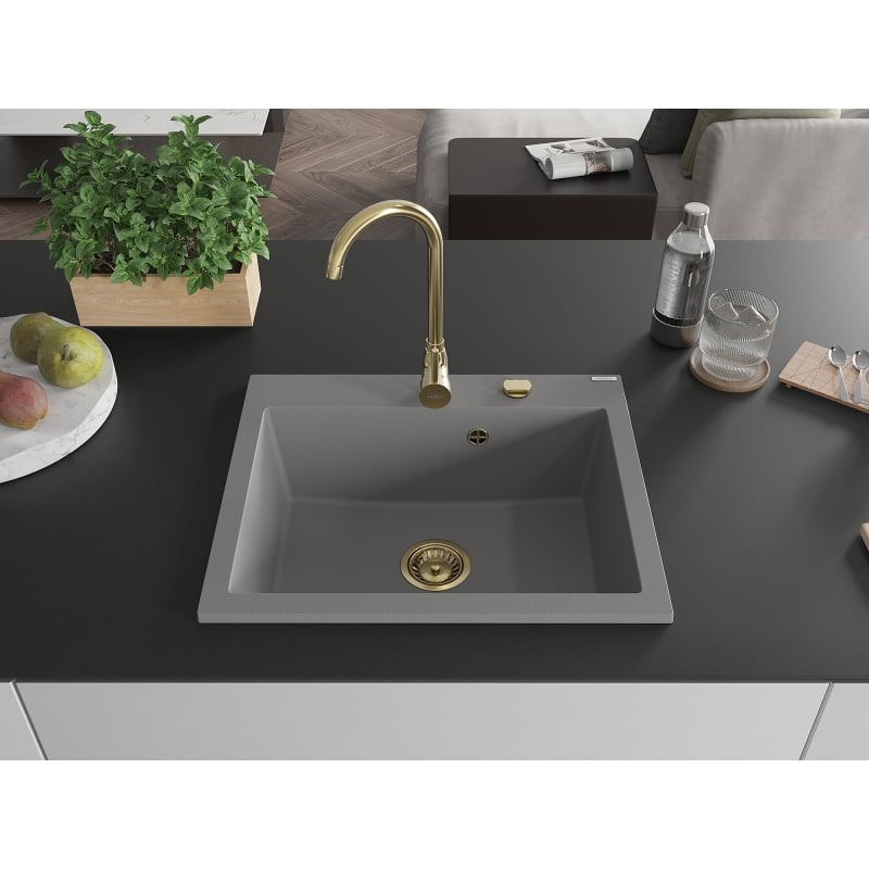 Jednodřezový žulový dřez Mexen Elix 600 x 500 mm, šedý, zlatý sifon - 6525601005-71-G