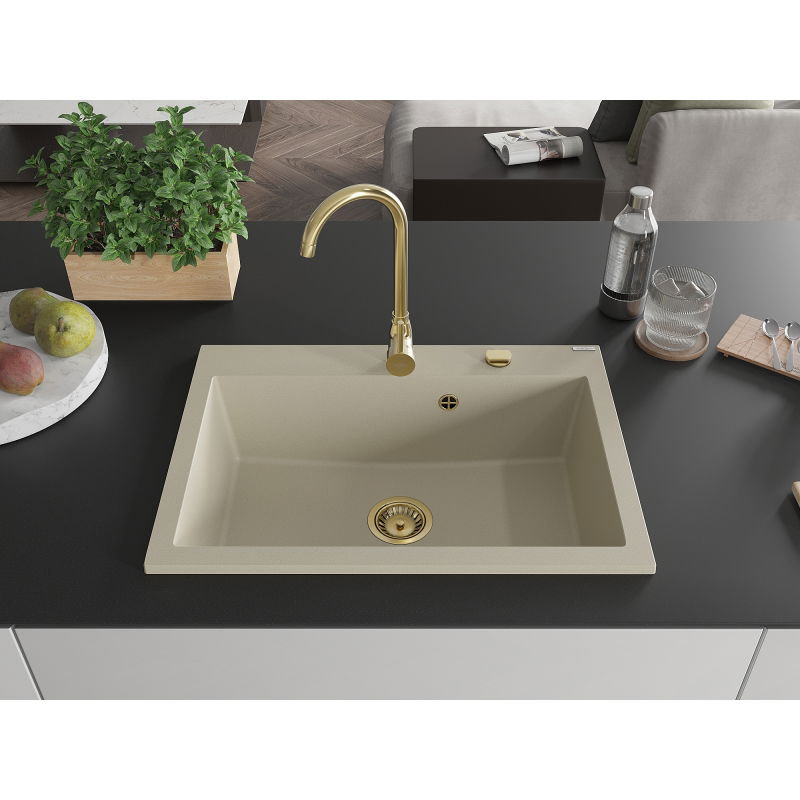 Jednodřezový žulový dřez Mexen Elix 700 x 500 mm, béžový, zlatý sifon - 6526701005-69-G