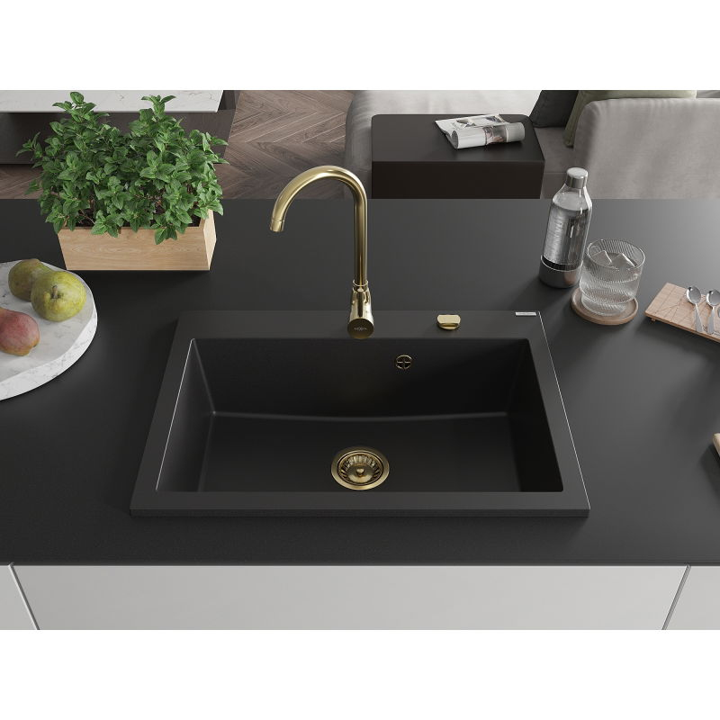 Jednodřezový žulový dřez Mexen Elix 700 x 500 mm, černý, zlatý sifon - 6526701005-77-G