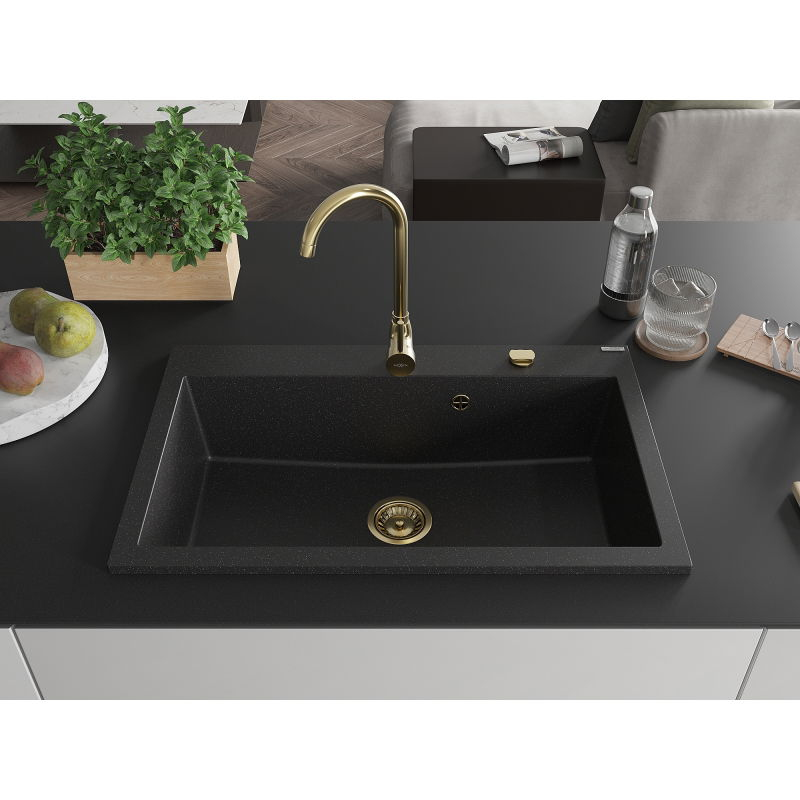 Jednodřezový žulový dřez Mexen Elix 800 x 500 mm, černá/stříbrná metalíza, zlatý sifon - 6527801005-73-G