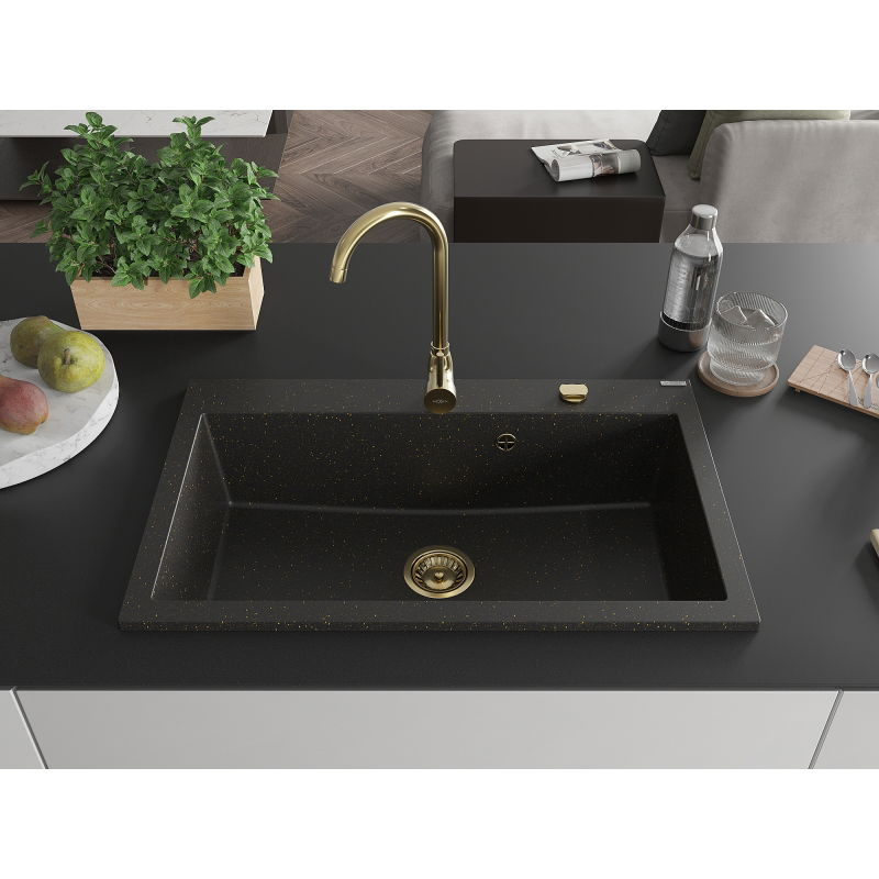 Jednodřezový žulový dřez Mexen Elix 800 x 500 mm, černá/zlatá metalíza, zlatý sifon - 6527801005-75-G