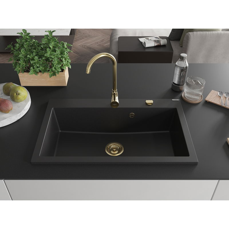 Jednodřezový žulový dřez Mexen Elix 800 x 500 mm, černý, zlatý sifon - 6527801005-77-G