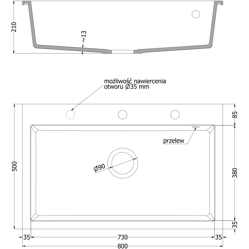 Specifikace produktu: Rozměr: 800x500x210 mm Hloubka dřezu: 195 mm Rozměry dřezu: 730x380 mm Průměr odtoku: ø90 mm Typ: 1-dřez Typ: Vestavný Materiál: Žula Barva: Černá Povrchová úprava sifonu: Zlatá Otvor pro přepad: Ano Otvor pro baterii: Ano Automatický sifon součástí balení Vysoká odolnost proti poškrábání a změně barvy Odolnost proti teplotním šokům Povrch pro snadné čištění Jeden další frézovaný otvor pro samoděrování ø35