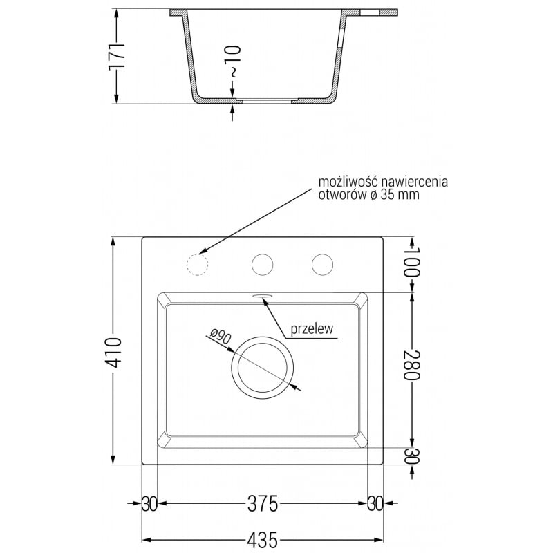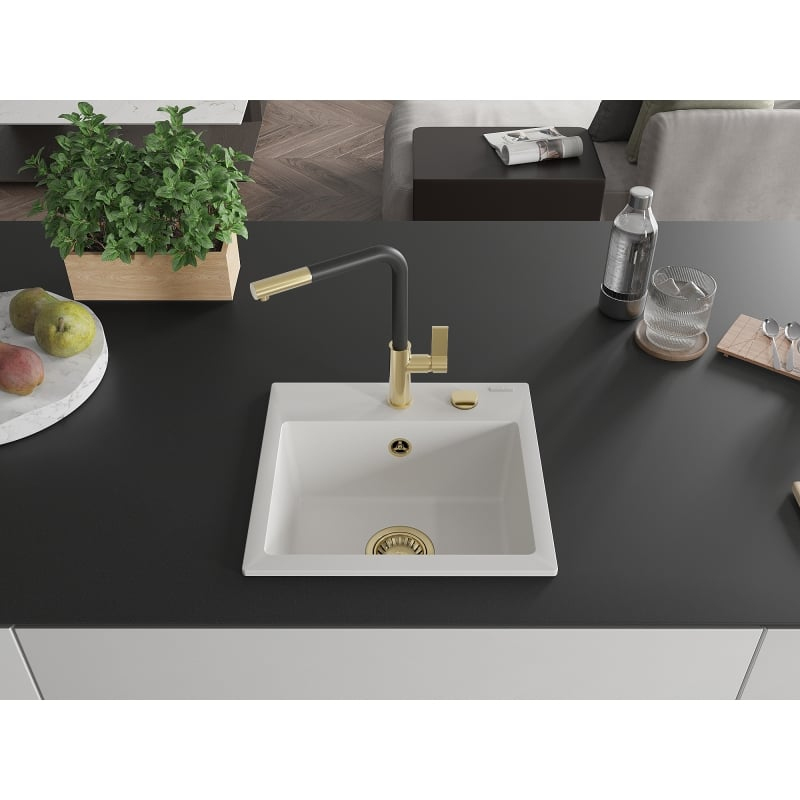 Technické údaje: Dřez: Rozměr: 435x410x171 mm Hloubka dřezu: 161 mm Rozměry dřezu: 375x280 mm Průměr odtoku: ø90 mm Typ: 1-dřezový Typ: Vestavný Barva: Bílá Povrchová úprava sifonu: Zlatá Materiál: Žula (80 % žulového kameniva, 20 % pryskyřic) Přepadový otvor: Ano Otvory: (automatická baterie) 2 Vysoká odolnost proti poškrábání a změně barvy Odolnost vůči teplotním šokům Povrch pro snadné čištění Jeden další vyfrézovaný otvor pro samovrtání ø35 Kuchyňská baterie: Materiál: Mosaz Barva: Zlatá/Černá Kartuše: Keramická Perlátor: Ano Typ: Pákový Rozsah výtoku: 245 mm Výška baterie: 307 mm