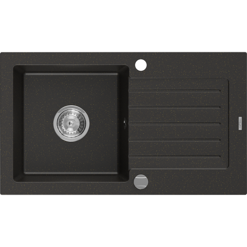 Specifikace produktu: Rozměr: 752x436x161 mm Hloubka dřezu: 151 mm Rozměry dřezu: 356x332 mm Průměr odtoku: ø90 mm Typ: 1 dřez s odkapávačem Typ: Vestavný Materiál: Žula Barva: Černá/zlatá metalíza Povrchová úprava sifonu: Chrom Otvor pro přepad: Ano Otvor pro baterii: Ano Automatický sifon součástí balení Vysoká odolnost proti poškrábání a změně barvy Odolnost proti teplotním šokům Povrch pro snadné čištění Dva další frézované otvory pro samoděrování ø35