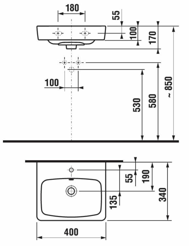 Nábytkové umývátko s otvorem pro baterii uprostřed o šířce 40 cm, hloubce 34 cm a výšce 17 cm. Balení bez sifonu a baterie. Montážní sadu je nutné dokoupit.