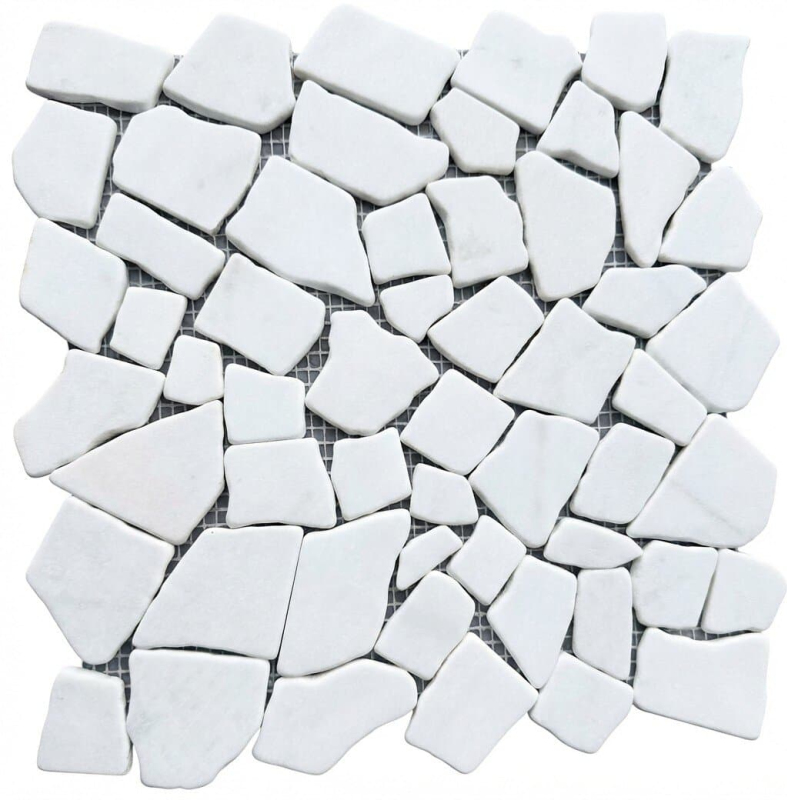 Mrazuvzdorné. Kamenná mozaika v bílé barvě o rozměru 30,5x30,5 cm a tloušťce 7 mm a v imitaci kamene s matným povrchem. Základní prvek má nepravidelný tvar