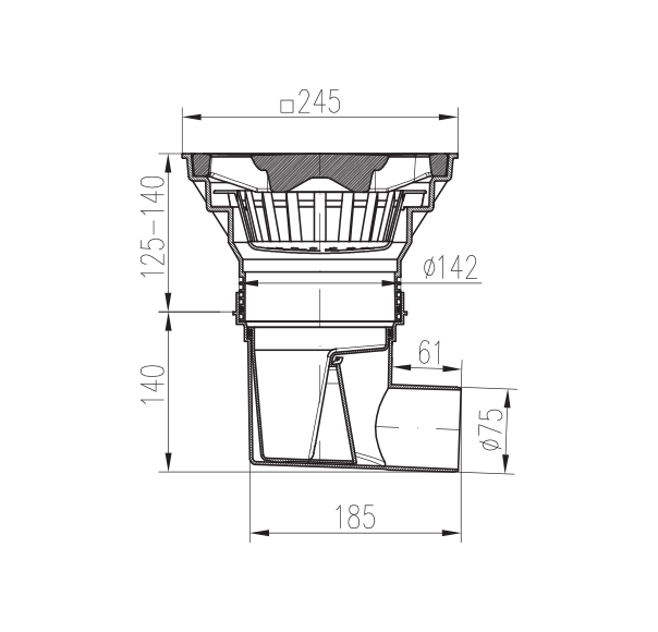 Kanalizační vpusť boční D75-250 suchá klapka, límec, plastová mřížka se zámkem 436 Sz