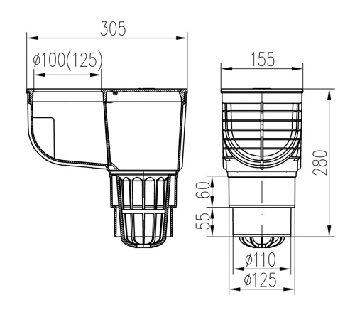 Lapač střešních splavenin spodní D110/D125, litinový povrch, pro svod D100 325 C Li/100