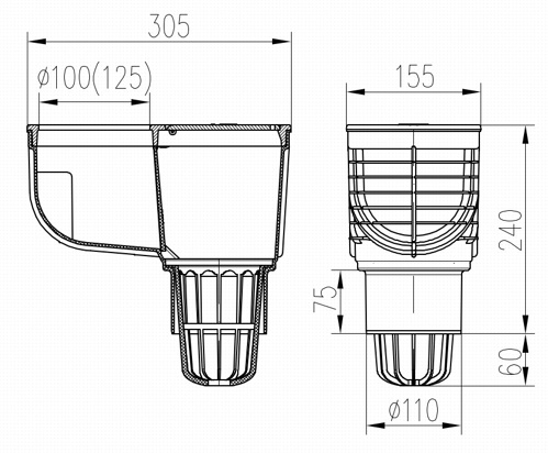 Lapač střešních splavenin spodní D110, litinový povrch, pro svod D125 325 A Li/125
