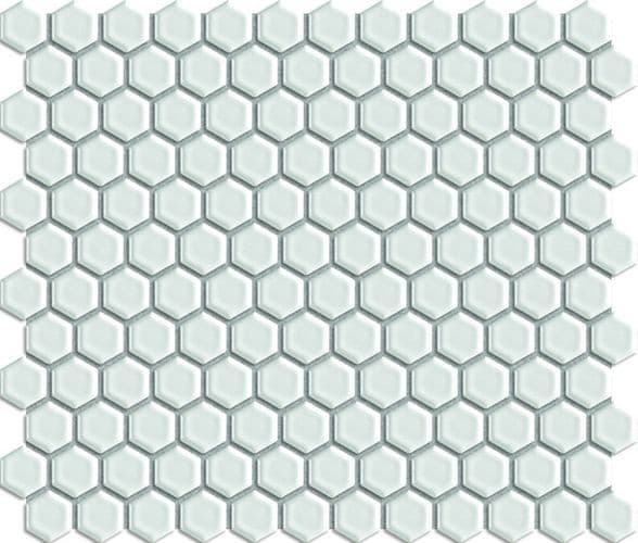 Mrazuvzdorné. Keramická mozaika v bílé barvě o rozměru 26x30 cm s matným povrchem. Základní prvek ve tvaru hexagon (šestihran) o rozměru 2,6x2,6 cm