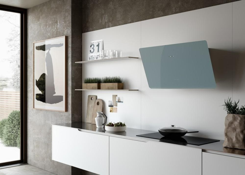 Komínová digestoř Faber GLAM LIGHT ZERO DRIP DB A80 (80 cm) v šedomodré matné. Štěrbinové a dvojité sání účinně zachytí páru, technologie Zero Drip zabrání stékání kondenzátu. 3 stupně + INT, doběh 30 min, dotykové ovládání SQUARCLE, 2× LED 4000 K, třída B.