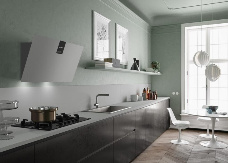 Komínová digestoř Faber SOFT EDGE GRIGIO LONDRA A80 (80 cm) v šedém FENIX NTM: matný soft‑touch povrch odolný proti otiskům, snadno se čistí a drobné škrábance lze zacelit teplem. A+, štěrbinové/dvojité sání, 3 rychlosti + intenzivní, doběh 30 min, 2× LED. Příprava pro externí motor i rekuperaci.