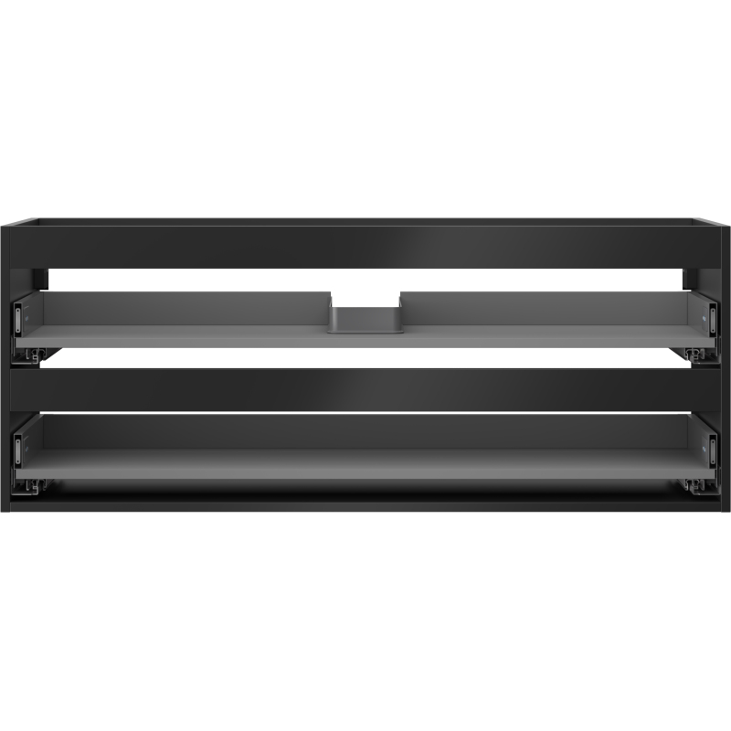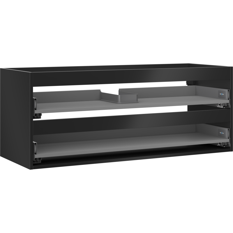 Specifikace produktu: Šířka: 120 cm Hloubka: 44,2 cm Výška: 47 cm Barva: Matná černá Typ: Závěsné Materiál: Lakovaná deska Počet zásuvek: 2 Vodítka s funkcí tlumeného dovírání Plný výsuv pro snadný přístup k obsahu zásuvky Povrch odolný vůči UV záření Kombinovatelný s dvířky ze série Orio, Rivel Produkt smontovaný