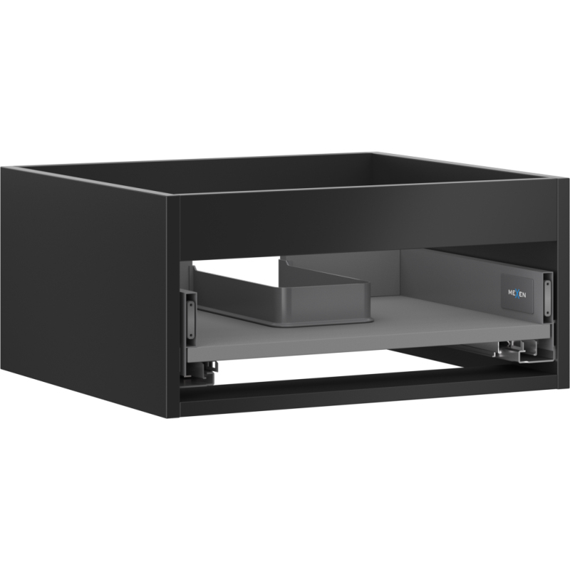 Specifikace produktu: Šířka: 50 cm Hloubka: 44,2 cm Výška: 23,5 cm Barva: Matná černá Typ: Závěsné Materiál: Lakovaná deska Počet zásuvek: 1 Vodítka s funkcí tlumeného dovírání Plný výsuv pro snadný přístup k obsahu zásuvky Povrch odolný vůči UV záření Kombinovatelný s dvířky ze série Orio, Rivel Produkt smontovaný