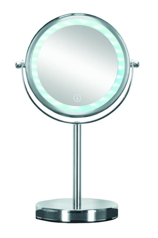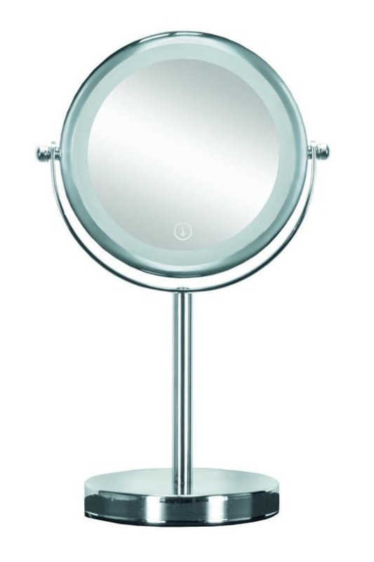 Kosmetické zrcátko zvětšovací s LED osvětlením na postavení. Oboustranné: 5-ti násobné zvětšení / druhá strana 1x zvětšení. Dotykový vypínač. Průměr 15cm. Baterie 4x AAA nejsou součástí balení. Celkové rozměry: 17,5x29,5x12cm šxvxh. Barva: chrom.