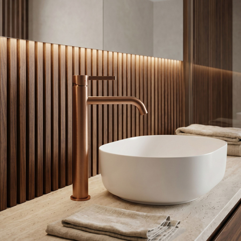 Vysoká umyvadlová baterie Foster v barvě Brushed Copper je návrh spojující surovou formu se zajímavým detailem. Její zvýšené tělo bylo navrženo tak, aby zajistilo naprostou volnost pohybu u umyvadel na desku.Optimální výška – konstrukce baterie umožňuje její pohodlnou montáž vedle umyvadla na desku, což zaručuje správný dosah proudu vody a zabraňuje rozstřikování během každodenního používání.Ozdobný vzor na baterii – horní část těla má přesné, soustředné drážky. Tento geometrický detail odlišuje sérii Foster a dodává armatuře moderní charakter.Povrchová úprava Brushed Copper (PVD) – pokročilá technologie nanášení povlaku zajišťuje nejvyšší odolnost proti poškrábání. Matná struktura je praktická – účinně maskuje skvrny od vody a otisky prstů.Pevná konstrukce – tělo vyrobené z mosazi a keramická kartuše jsou zárukou těsnosti a plynulé regulace teploty vody po mnoho let.Industriální design – díky jednoduché, válcové linii a ploché rukojeti se baterie skvěle hodí do moderních interiérů.Výběrem vysoké baterie Foster sázíte na odolný prvek vybavení, který si díky technologii PVD zachová estetický vzhled po dlouhá léta.