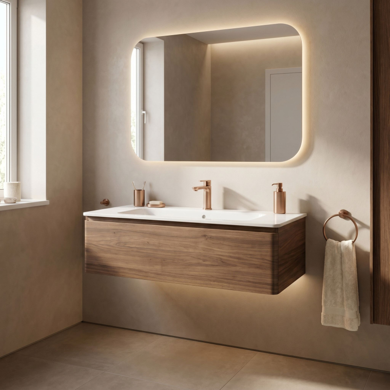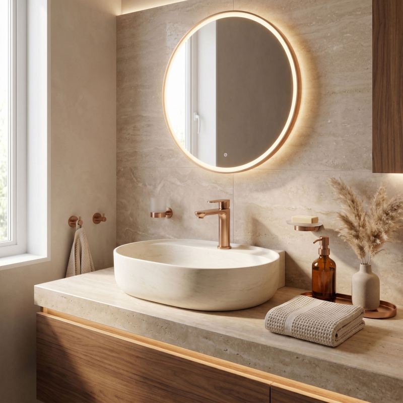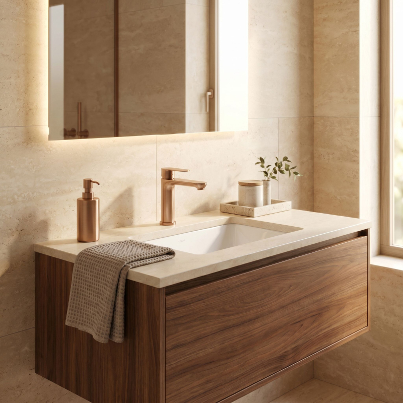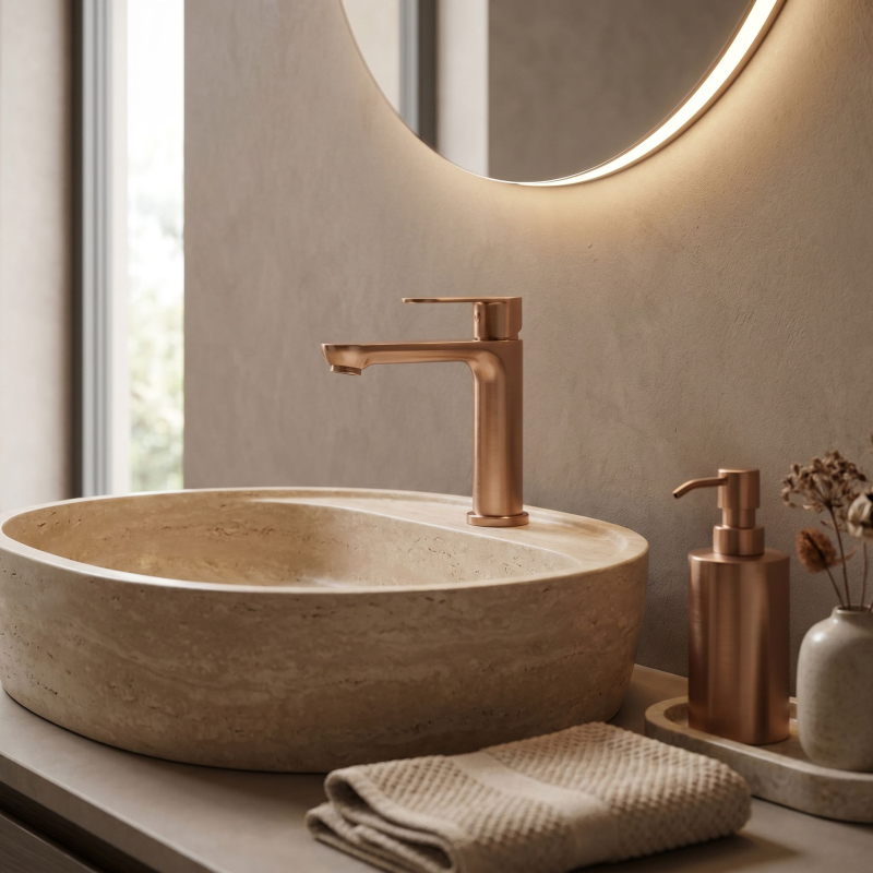 Nízká umyvadlová baterie Logan v barvě Brushed Copper je spojením jednoduché formy s vysokou funkčností. Díky nízké konstrukci je to ideální model pro umyvadla zapuštěná do desky, umyvadla pod desku a umyvadla s továrním otvorem pro armaturu.Povrchová úprava Brushed Copper (PVD) – technologicky vyspělý PVD povlak poskytuje výjimečnou odolnost proti poškrábání a vnějším vlivům. Ušlechtilý, matný odstín v kartáčovaném provedení je velmi praktický – účinně maskuje skvrny od vody a otisky prstů a zároveň vnáší do interiéru teplý, originální akcent.Pevné mosazné tělo – zpracování z vysoce kvalitní mosazi je zárukou trvanlivosti, stability a plné odolnosti proti korozi po léta používání.Keramická kartuše – vnitřek baterie je vybaven špičkovou keramickou kartuší, což se promítá do plynulé a přesné regulace proudu a teploty vody.Ergonomický design – plochá, pohodlná rukojeť a vhodně profilovaný výtok zajišťují pohodlné každodenní používání a zároveň udržují moderní vzhled mycí zóny.Výběrem baterie Logan v barvě Brushed Copper získáte spolehlivý koupelnový prvek, který si díky odolnému PVD povlaku a pevným materiálům zachová svůj jedinečný, luxusní vzhled a funkčnost po dlouhou dobu.