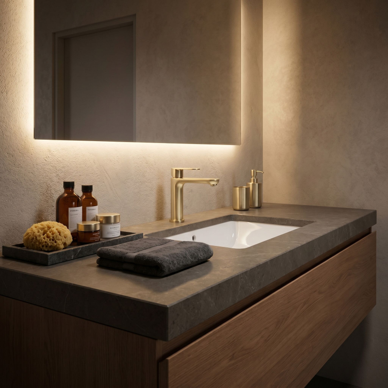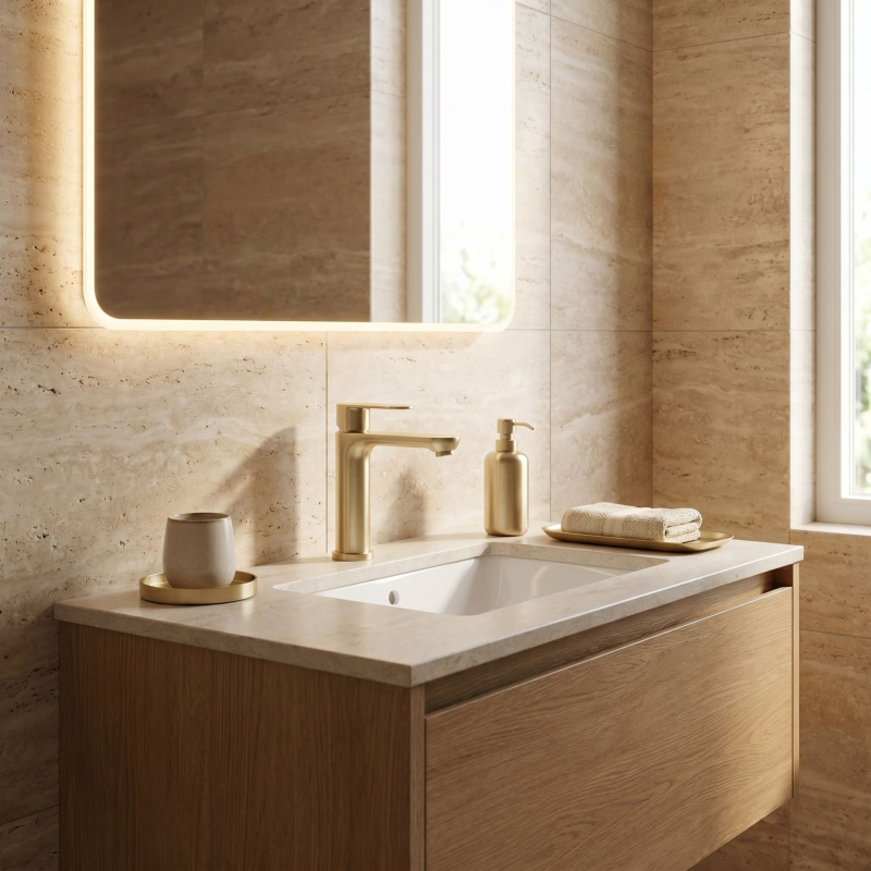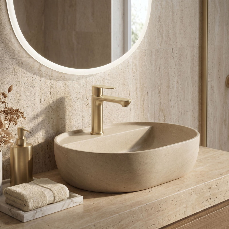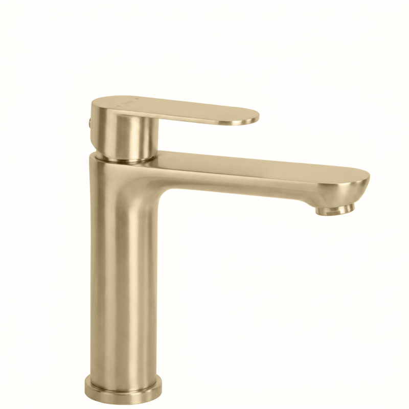 Nízká umyvadlová baterie Logan v barvě Brushed Gold je spojením jednoduché formy s vysokou funkčností. Díky nízké konstrukci je to ideální model pro umyvadla zapuštěná do desky, umyvadla pod desku a umyvadla s továrním otvorem pro armaturu.Povrchová úprava Brushed Gold (PVD) – technologicky vyspělý PVD povlak poskytuje výjimečnou odolnost proti poškrábání a vnějším vlivům. Ušlechtilý, matný odstín v kartáčovaném provedení je velmi praktický – účinně maskuje skvrny od vody a otisky prstů a zároveň vnáší do interiéru teplý, elegantní akcent.Pevné mosazné tělo – zpracování z vysoce kvalitní mosazi je zárukou trvanlivosti, stability a plné odolnosti proti korozi po léta používání.Keramická kartuše – vnitřek baterie je vybaven špičkovou keramickou kartuší, což se promítá do plynulé a přesné regulace proudu a teploty vody.Ergonomický design – plochá, pohodlná rukojeť a vhodně profilovaný výtok zajišťují pohodlné každodenní používání a zároveň udržují moderní vzhled mycí zóny.Výběrem baterie Logan v barvě Brushed Gold získáte spolehlivý koupelnový prvek, který si díky odolnému PVD povlaku a pevným materiálům zachová svůj luxusní vzhled a funkčnost po dlouhou dobu.