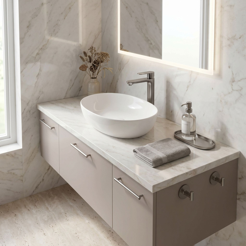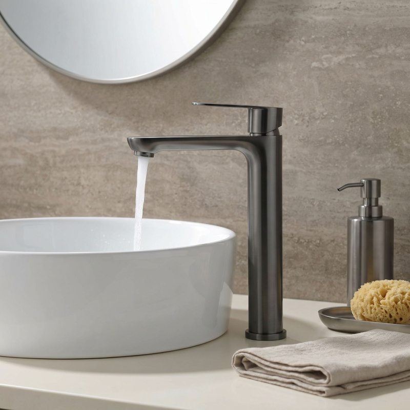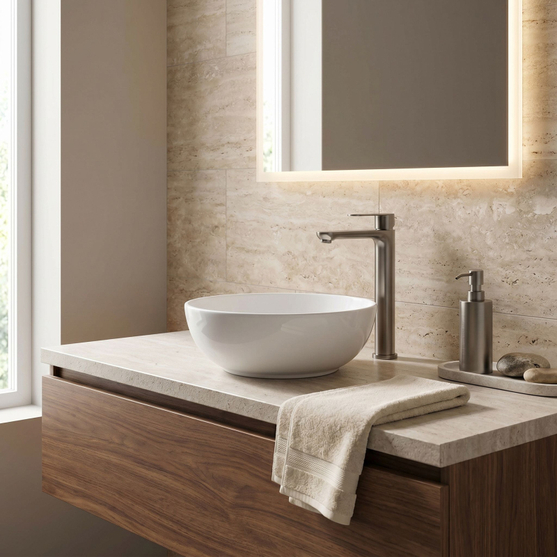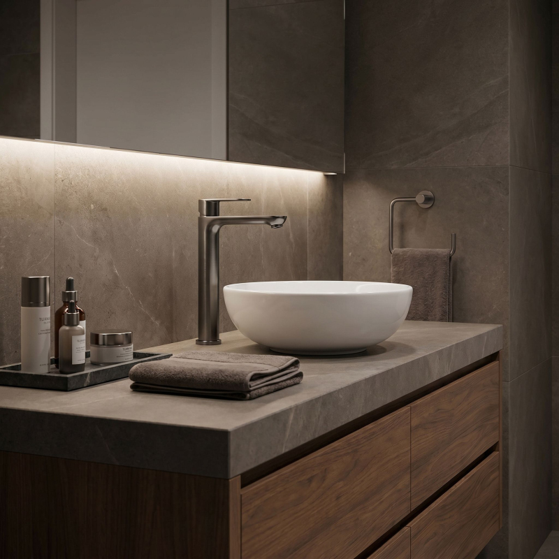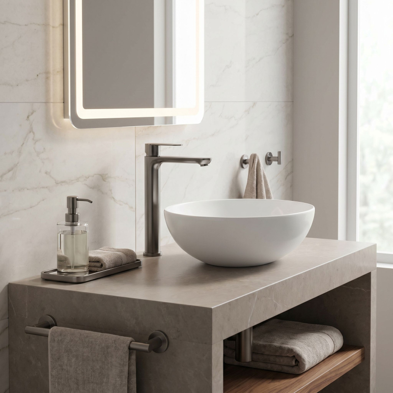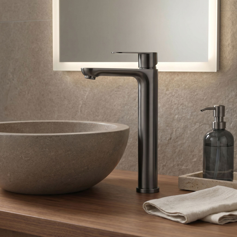 Vysoká umyvadlová baterie Logan v barvě Titanium je elegantní řešení navržené pro moderní koupelny. Díky své výšce je tento model ideální pro montáž přímo na desku vedle umyvadel na desku.Povrchová úprava Titanium (PVD) – technologicky vyspělý PVD povlak poskytuje výjimečnou odolnost proti poškrábání a korozi. Hluboký, tmavě šedý odstín vnáší do interiéru výrazný, industriální akcent a je velmi praktický, protože účinně snižuje viditelnost skvrn od vody a otisků prstů.Vysoké tělo – design baterie byl optimalizován pro umyvadla na desku, poskytuje dostatečný prostor a vysoký komfort při každodenním používání.Pevné mosazné tělo – vyrobeno z vysoce kvalitní mosazi, zaručuje plnou stabilitu a dlouholetou životnost produktu.Keramická kartuše – použití špičkové keramické kartuše umožňuje plynulou a přesnou regulaci proudu a teploty vody.Moderní linie – štíhlý, válcový tvar v kombinaci s plochou, ergonomickou rukojetí zajišťuje, že model Logan dokonale ladí s minimalistickou koupelnovou architekturou.Výběrem vysoké baterie Logan v barvě Titanium získáte spolehlivou armaturu, která díky odolnému PVD povlaku vnáší do interiéru moderní charakter a zachová si estetický vzhled po mnoho let.