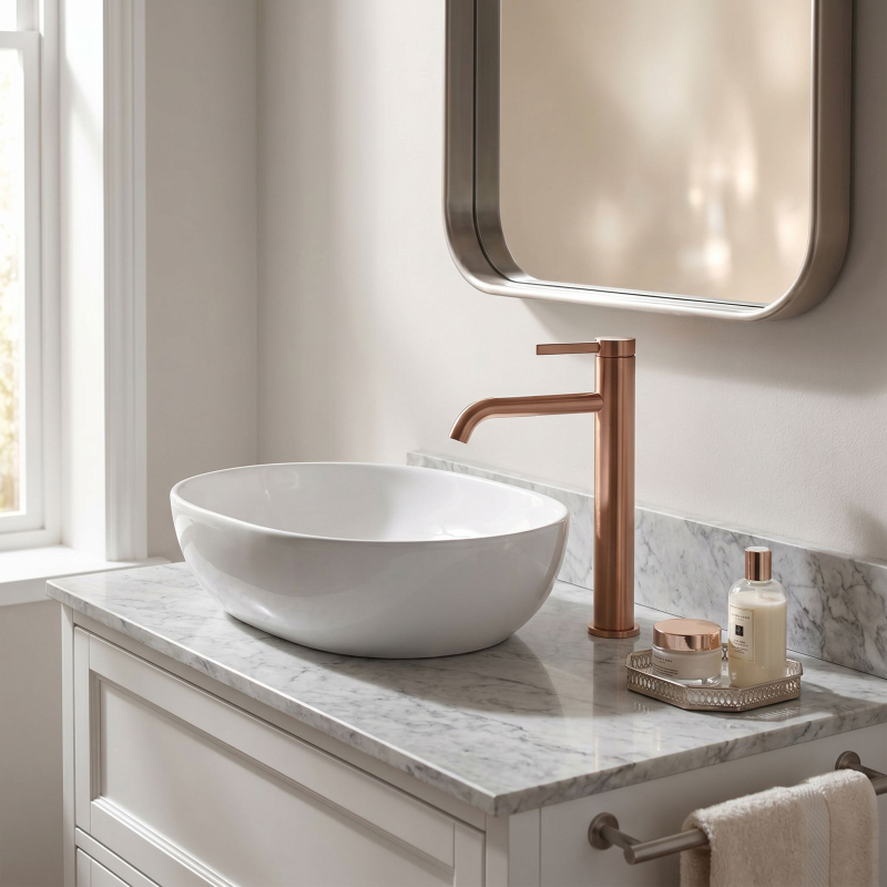 Vneste do své koupelny teplý, designový akcent díky vysoké umyvadlové baterii Rea Rivo v povrchové úpravě Brushed Copper. Tento štíhlý model byl navržen pro moderní umyvadla na desku, kde záleží jak na komfortu používání, tak na výrazném stylu celého aranžmá. Válcové tělo, zaoblený výtok a minimalistická rukojeť tvoří ucelenou formu, která skvěle zapadá do aktuálních trendů v interiérovém designu.Vysoká konstrukce – zajišťuje pohodlí při používání a ideálně ladí s umyvadly na desku.Barva Brushed Copper – teplý, saténový povrch s jemnou strukturou zdůrazňuje eleganci interiéru.Zaoblený výtok – moderní forma zajišťuje estetiku a komfort používání.Perlátor – provzdušňuje proud vody, čímž zvyšuje komfort a podporuje úsporu.Páková baterie – rychlá a intuitivní regulace teploty a proudu.Vysoká umyvadlová baterie Rea Rivo Brushed Copper je ideálním spojením stylu a funkčnosti. Teplý odstín mědi vnáší do koupelny výjimečnou atmosféru a štíhlá forma působí u umyvadla na desku dokonale.